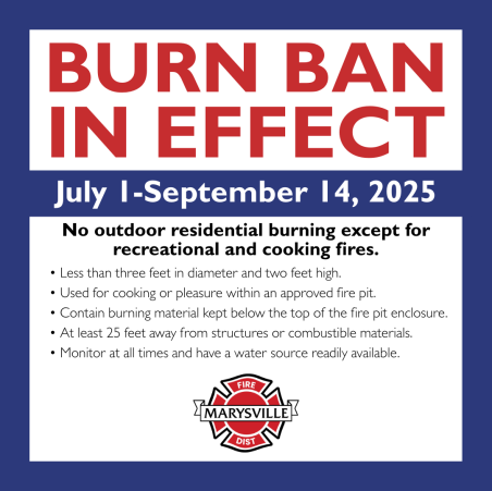 Fire Safety burn bans may be issued for safety during hot and/or dry conditions. The Marysville Fire District follows fire safety bans issued by the Snohomish County Fire Marshal. If a burn ban is issued in Snohomish County, that ban is effective within the City of Marysville and the entire Marysville Fire District service area.